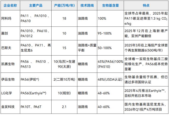 全球生物基尼龙市场主要由几家国际化工巨头和新兴生物制造企业主导,截至2025年底,全球主要生产商产能布局如下: